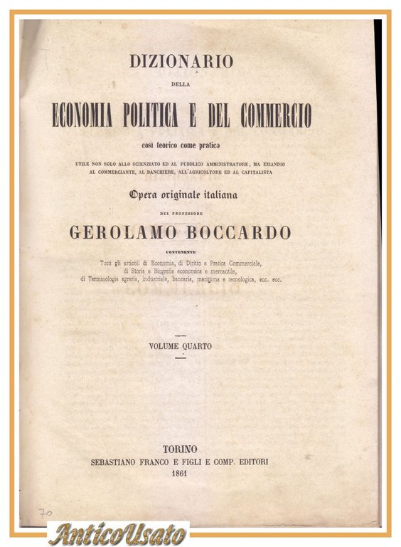 DIZIONARIO DI ECONOMIA POLITICA E DEL COMMERCIO volume 4 di Boccardo 1861 Antico