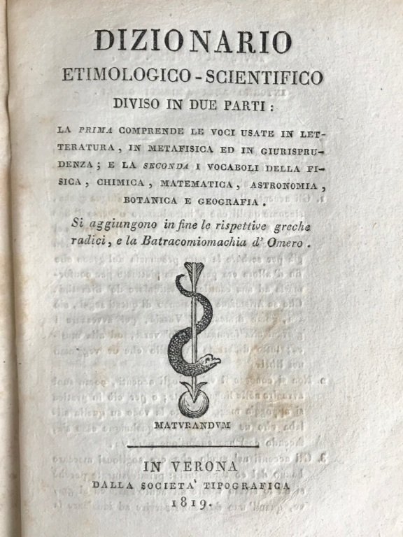 In-16° (cm. 15,6), brossura azzurra coeva con titolo ms. al dorso (lievi segni d'usura); pp. [4] 457 [1b] 18 [6] 11 [1] 459-537 [1b] in buono stato, a fogli chiusi e in barbe; lievi fioriture sparse; secondo frontespizio Almanacco etimologico scientifico per l'anno 1819 (datato 1818); terza parte con frontespizio proprio (datato 1820). «La prima comprende le voci usate in letteratura, in metafisica ed in giurisprudenza; e la seconda i vocaboli della fisica, chimica, matematica, astronomia, botanica e geografia. Si aggiungono in fine le rispettive greche radici, e la Batracomiomachia d'Omero». Esemplare molto buono. (NK7)