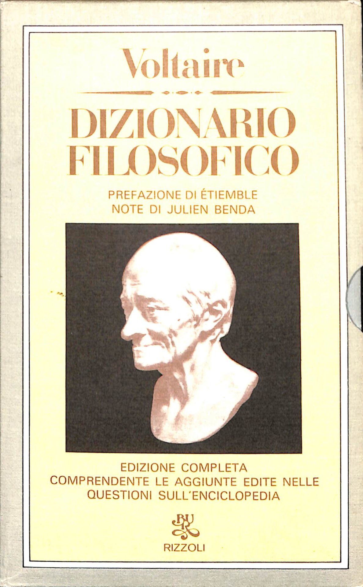 Dizionario filosofico : comprendente, oltre ai 118 articoli apparsi nelle varie edizioni di quest'opera pubblicate durante la vita di Voltaire, i loro supplementi editi nelle Questions sur l'Encyclopedie. 2 volumi in cofanetto (671 p. compless.) ; 18 cm. 100 - Ba Ottimo (Fine)