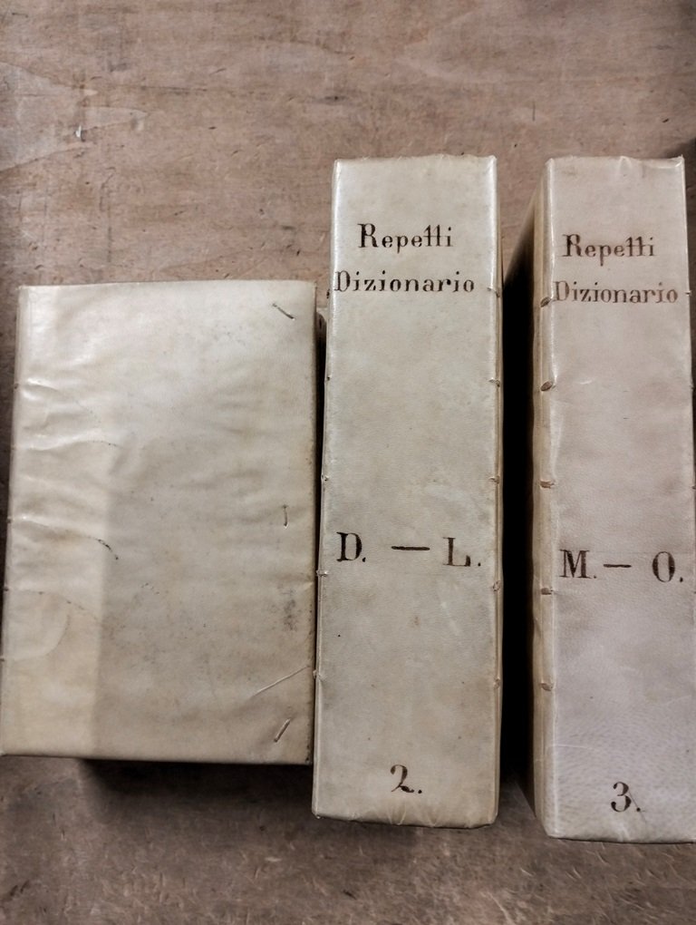 8° (cm. 24,5) bella legat. in piena pergamena coeva, tit. manoscr. al dorso, opera completa in 5 volumi + un sesto contenente l'Introduzione, il Supplemento e l'Appendice al "Dizionario", pp. 842, (1); 955; 710, (1); 844, (2); 868; 278; VIII-CLVII,(1). Con la grande carta geografica della Toscana del Segato, numerose tabelle nel testo,14 tavole genealogiche in grande formato (su 15, manca la III) e quattro carte raffiguranti il Territorio di Carrara, la Comunità di Siena, il Territorio di Signa e la veduta del ponte sull'Arno presso Bocca di Zambra. Manca il ritratto del Repetti al I° vol. Celebre monumentale opera in edizione originale. Inghirami, II, 130. Bigazzi, 5698. Platneriana, 391. Choix, 1357. Lozzi, 5431 (nota). Qualche fioritura della carta ma buon esemplare.