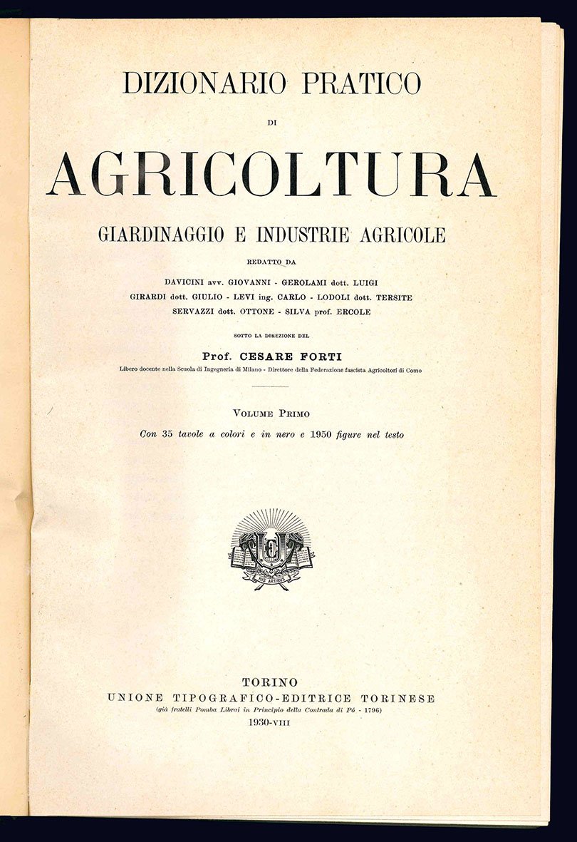 Dizionario pratico di agricoltura giardinaggio e industrie agricole redatto da Davicini avv. Giovanni - Gerolami dott. Luigi - Girardi dott. Giulio - Levi ing. Carlo - Lodoli dott. Tersite - Servazzi dott. Ottone - Silva prof. Ercole sotto la direzione del Prof. Cesare Forti libero docente nella Scuola di Ingegneria di Milano - Direttore della Federazione fascista Agricoltori di Como.