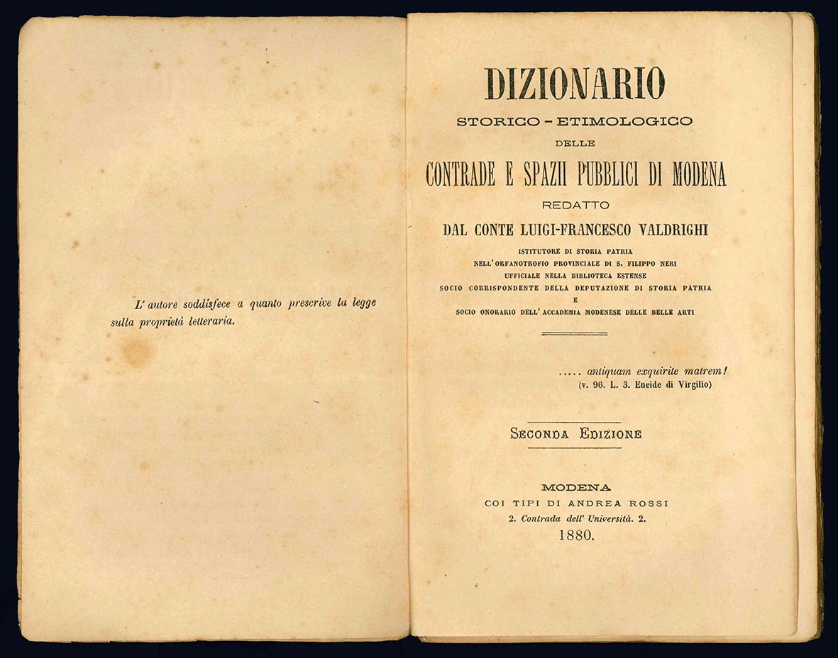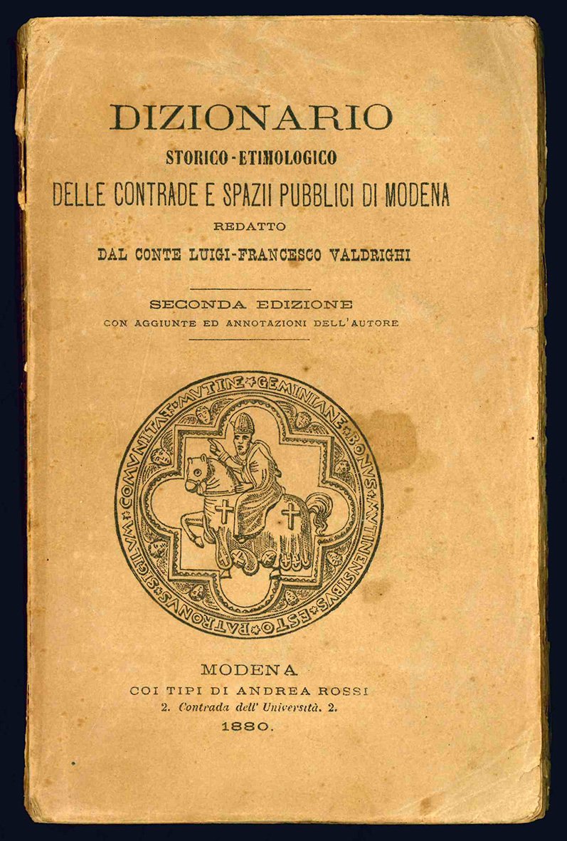 Dizionario storico-etimologico delle contrade e spazio pubblici di Modena redatto dal conte Luigi Francesco Valdrighi. Seconda edizione con aggiunte ed annotazioni dell'autore.