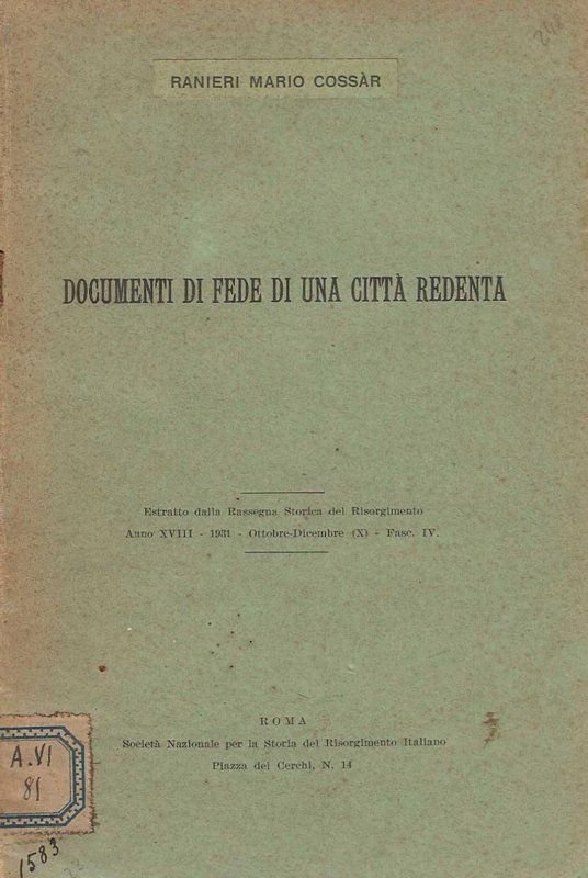 Documenti di fede di una città redenta (Estratto dalla Rassegna storica del Risorgimento).