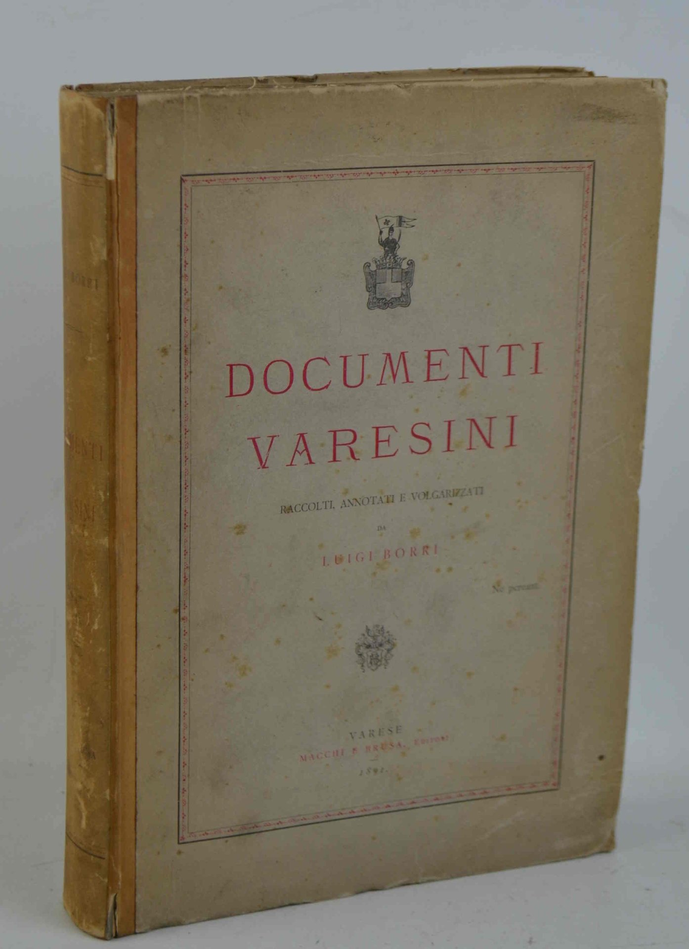 Cm. 28, pp. (2) 475 (1) + 5 d'indici e (6) d'errata ed indici delle tavole. Con 19 belle tavole f.t. di cui alcune ripiegate (due mappe della città e dintorni ed un fac-simile della "Pergamena di Ariberto") e le altre con stemmi e costumi prevalentemente in litografia a colori. Legatura originale in cart. rigido con titoli a stampa. Pochi segni d'uso, esemplare genuino ed in buono stato di conservazione. Edizione originale ed unica, non comune, significativa fonte documentaria per la storia della città di Varese.