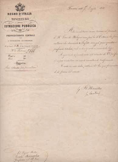 AUTOGRAFOCantoni prese parte all'insurrezione delle Cinque Giornate di Milano ed ebbe l'incarico di organizzare la sollevazione dei giovani delle campagne milanesi. Divenne docente di fisica prima nella Reale scuola superiore e dal 1860 nell'università di Pavia. Non abbandonò mai l'attività politica: venne eletto deputato e nel 1870 segretario generale del ministero della Pubblica Istruzione. Il documento, compilato quando Firenze era capitale d'Italia, rigetta la promozione di Roncaglia ad insegnare nel Regio Liceo di Bologna. Roncaglia, autore di testi teatrali, scritti poetici e memorie, diventerà preside del Liceo Galvani di Bologna. Si aggiunge una carta con intestazione "Si pregano i signori Deputati a voler dare alla Segreteria della Camera le seguenti indicazioni". La carta riporta la firma e una nota autografa di Cantoni.