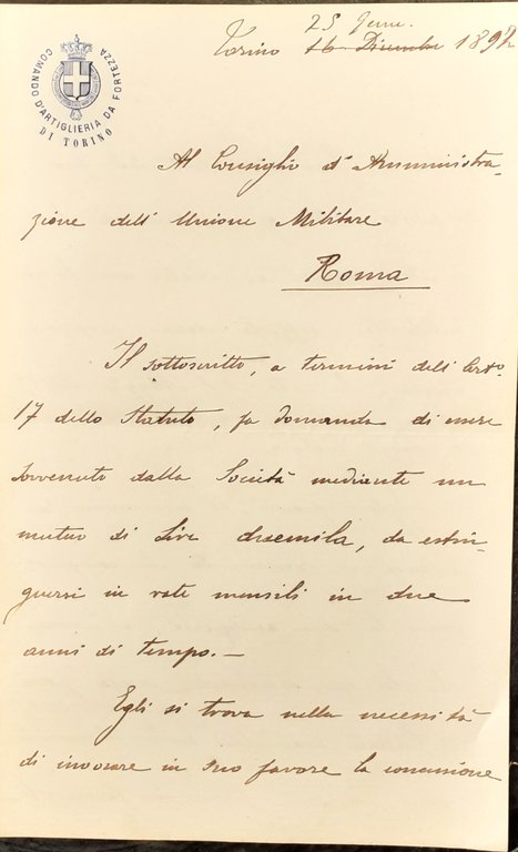 Documento originale 1892 Comando d'Artiglieria da Fortezza Torino