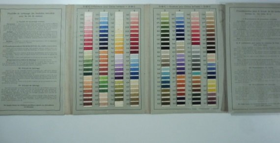 Cartella a 10 falde (ciascuna misura cm 14 x 21,5) con oltre 250 campioni di filo secondo le diverse gradazioni di colore, 12 pagine con tabelle, immagini dello stabilimento al contropiatto anteriore. Campionario di fili di cotone di questa ditta tessile con sede a Mulhouse, Belfort e Parigi. Non datato ma anni Trenta.