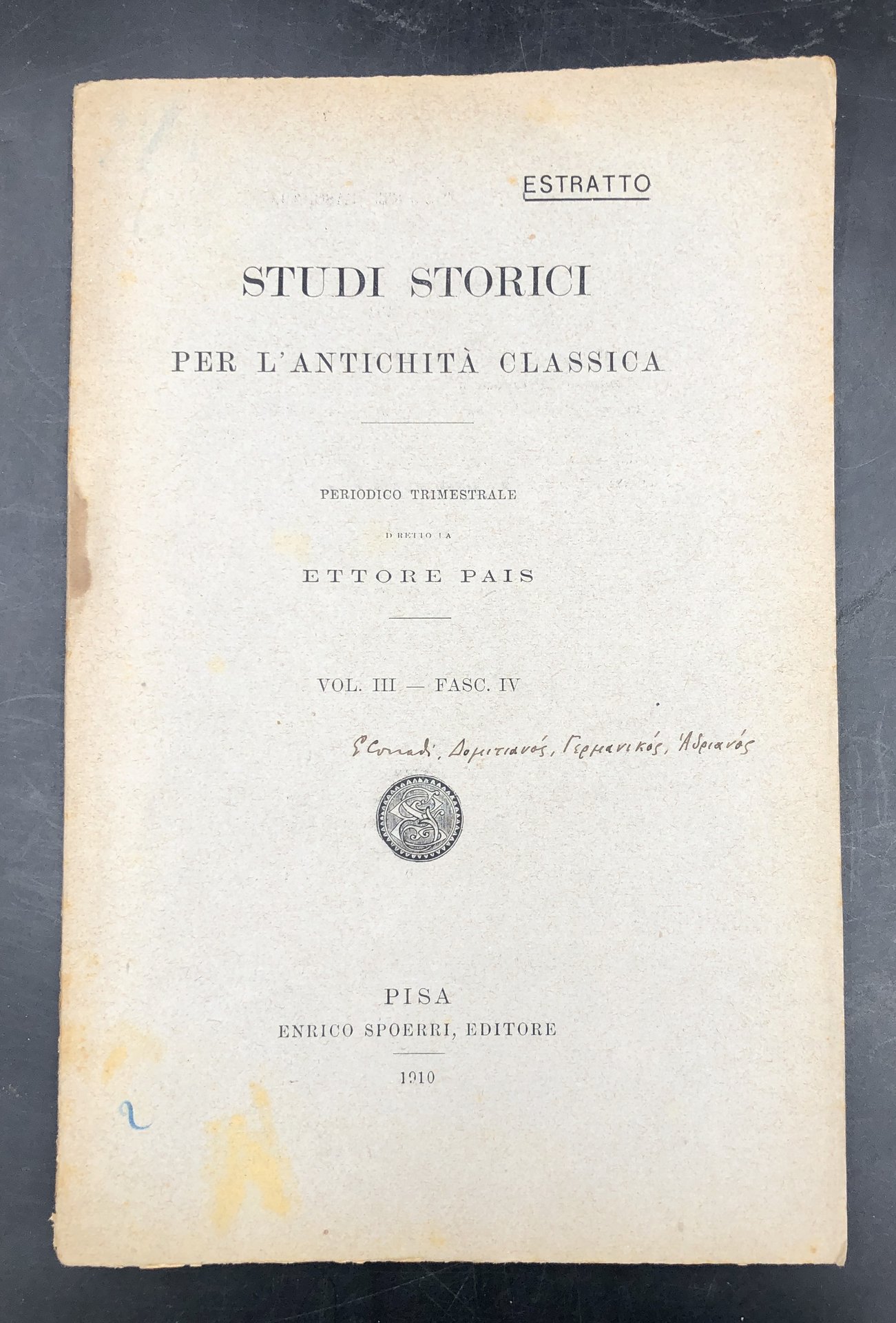 DOMITIANOS GERMANIKOS ADRIANOS [Domiziano Germanico Adriano]. Estratto orig. da Studi Storici per l'antichità classica, vol. III, fasc. IV.