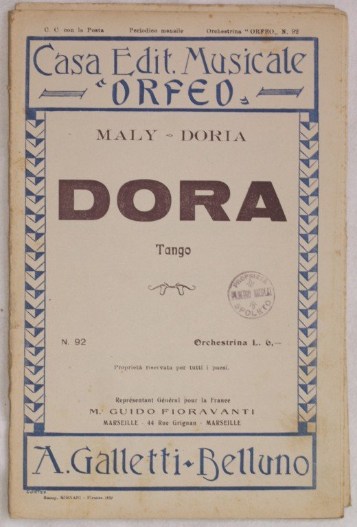 In 8. cm 27x17,5. Pp. 14. Partitura completa per orchestra del 1930 di una canzone. Caratteristica copertina decorata dell'epoca. Ex libris in copertina. Buone condizioni; bruniture in copertina; usure al dorso. A complete score for orchestra of 1930. Carachteristic decorated cover of that period. Ex libris in the cover. Good conditions, yellowings in the cover; worn spine.