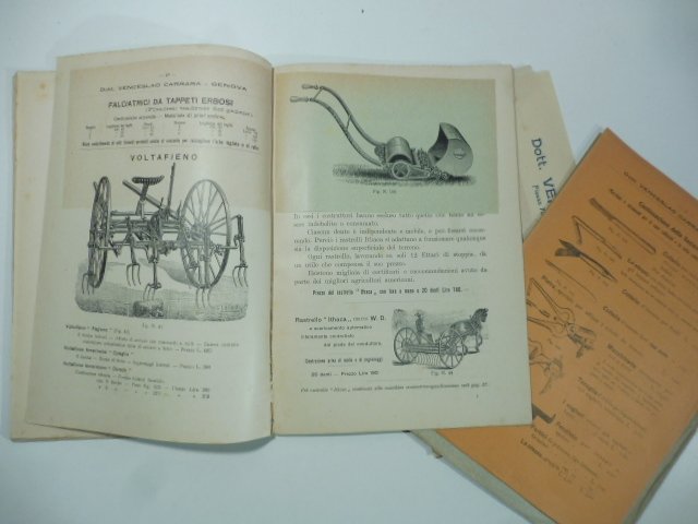 In 8 (cm 16,5 x 24), pp. 108 con illustrazioni in bianco/nero nel testo. Il piatto anteriore e' compreso nella numerazione delle pagine come pp. 1 e 2). Sono conservati all'interno un opuscolo su carta arancio di pp. 4 con coltelli, forbici, ronchetti; un opuscolo di pp. 8 con carri, ruote da carri; ecc.; due fogli sciolti. Brossura editoriale con dorso in tela. Catalogo riccamente illustrato di questa ditta specializzata nella produzione di macchine e strumenti per l'agricoltura fra i quali: locomobili, ruote da carri, carri, polivomeri, bivomeri, aratri, erpici, pianta-tuberi, rastrelli, scrematrici, zangole, torchi, frantoi per olive; ecc.