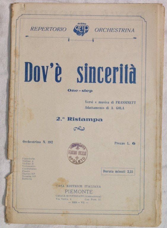 In 8. cm 26,5x18. Pp. 12. Partitura completa per orchestra del 1929 di una canzone. Caratteristica copertina decorata dell'epoca. Buone condizioni; dorso usurato. Ex libris sulla copertina. A complete score for orchestra of 1929. Carachteristic decorated cover of that period. Good conditions, worn edge. Ex libris in the cover.