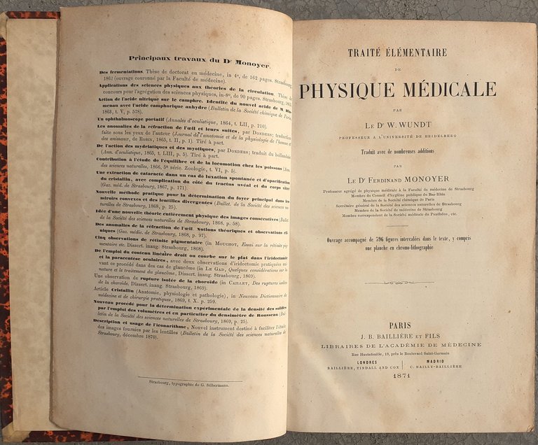 Dr. W. Wundt Traité élémentaire PHYSIQUE Médicale Paris 1871