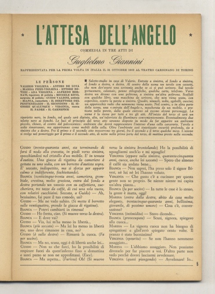Torino, Società Editrice Torinese, 1953, un fascicolo, in-8, br. editoriale con la copertina anteriore figurata a colori, pp. 62. Con illustrazioni n.t. Contiene: "L'attesa dell'angelo, commedia in tre atti di Guglielmo Giannini".