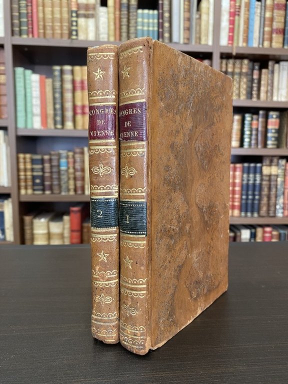 2 volumi in-8° (cm. 19,7), belle legature coeve in piena bazzana, dorsi lisci con titolo in oro su doppi tasselli bordeaux e verdi, filetti e fregi sempre in oro (piccoli forellini di tarlo, minime tracce d'uso alle cuffie inferiori), labbri ornati in oro, tagli e risguardi marmorizzati; pp. [4] XIX [1b] 274, [4] 266 [1b] in stato molto buono; lievi fioriture sparse. Seconda edizione, contemporanea all'originale, della nota analisi  di Pradt del ridisegno degli equilibri europei, conseguente alla caduta di Napoleone. L'autore, arcivescovo e diplomatico francese, più che un resoconto, descrive in quest'opera quanto il Congresso di Vienna dovrebbe portare all'Europa ed al mondo dopo l'epopea napoleonica. Ottimo esemplare. (SQ3)