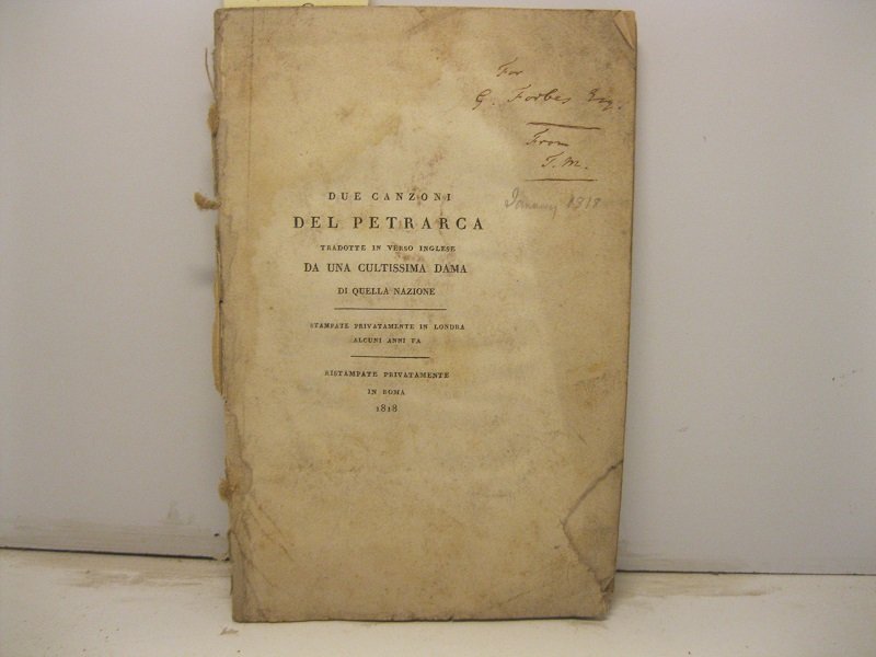 In 8, pp. XVII + (1). Dedica manoscritta al p. ant. Gora al marg. interno centrale delle cc. Piccola mancanza al fr. Br. rifatta con carta d'epoca. Ediz. italiana della traduzione inglese delle due canzoni petrarchesche 'Nella stagion che 'l ciel rapido inchina' e 'Di pensier in pensier, di monte in monte.' curata da B. Wilmot uscita a Londra nel 1815. Con testo a fronte inglese.