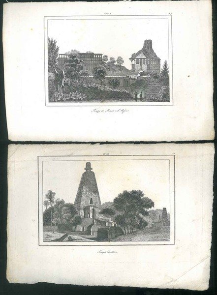 <p>Due incisioni 16x24 cm, parte incisa 10,5x15 cm. Raffigurano un tempio buddista e templi di Minal nel Mefvar. 1850 circa</p>
