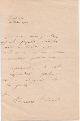 AUTOGRAFO“ [.] Albertini mi scrive che per questa storia di purismo mi metta in relazione con te. [.] Io ho ricevuto da letterati e non, innumeri lettere e appunti e proposte: delle quali renderò notizia, come già concordai coll’Albertini, in un ultimo conclusivo articolo [.]”. (Torino, 1 ottobre 1901).“ [.] sono giunte moltissime lettere con appunti, proposte, critiche [.] delle quali io toccherò, per non tediare i lettori con note sparse, in un unico articolo conclusivo che manderò prestissimo al Corriere [.]. (Grugliasco 1 ottobre 1901). Francesco Pastonchi collaborò con il Corriere della Sera dal 1902 all’anno della sua morte.