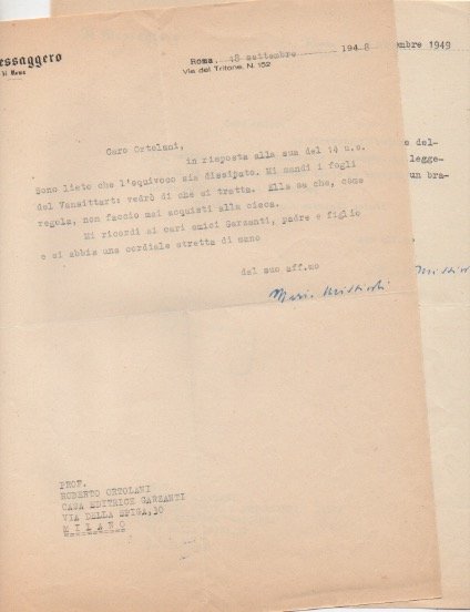 Due lettere dattiloscritte con firma autografa, datate 18 settembre 1948 e 7 novembre 1949 - Roma, inviate a Roberto Ortolani - Garzanti