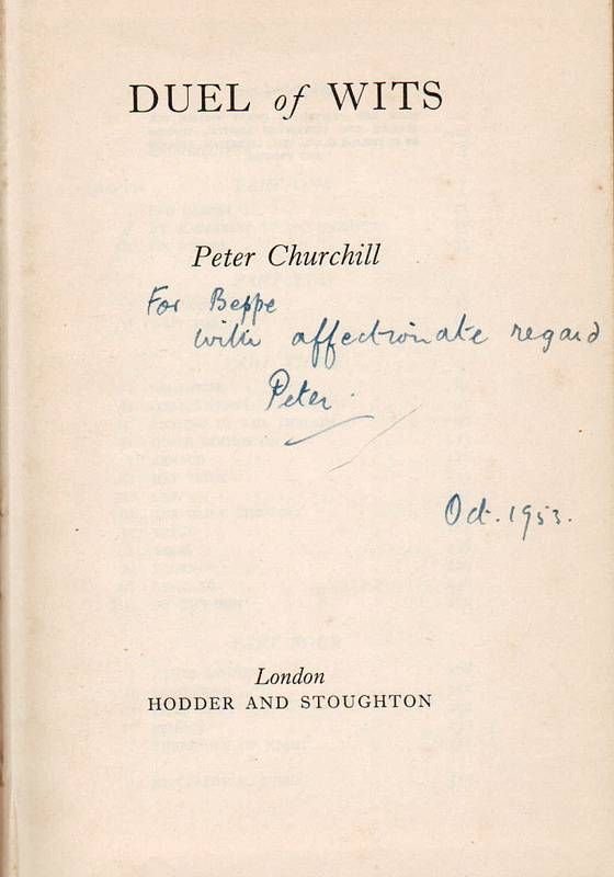 In-8°, legatura in tela editoriale, pp. 319, con dedica autografa firmata dall'autore al frontespizio. -(Peter Morland Churchill, (14 gennaio 1909 – 1 maggio 1972), è stato un ufficiale esecutivo delle operazioni speciali britanniche in Francia durante la seconda guerra, internato in campo di concentramento sopravvissuto.).