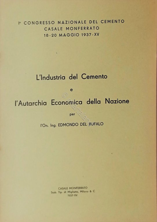 E. Del Bufalo - L'Industria del cemento e l'autarchia economica della nazione - ed. 1937 Testo in lingua italiana. Pagine 11 Copertina morbida. Condizioni molto boune.