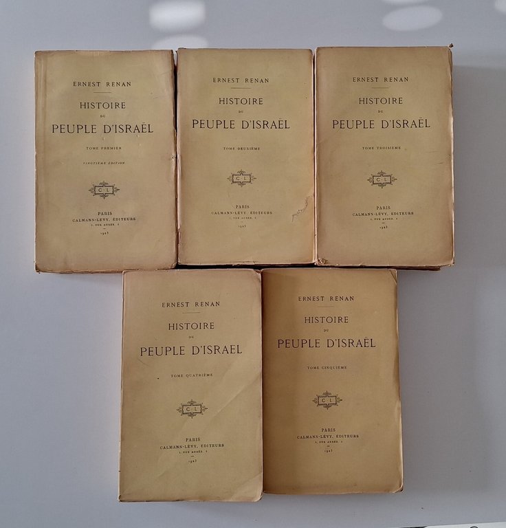 E. RENAN HISTOIRE DU PEUPLE D'ISRAEL CALMANN LEVY 5 VOLUMIIn 8°, legatura editoriale.Lievi segni alle copertine. Pagine fresche e pulite.TUTTI I NOSTRI LIBRI SONO VISIBILI PREVIO CONTATTO MAIL, TELEFONO O WHATSAPP NELLA NUOVA SEDE DI MILANO: LIBRERIA COSMOPOLIS, VIA JOMMELLI 22, MILANO.3313109672