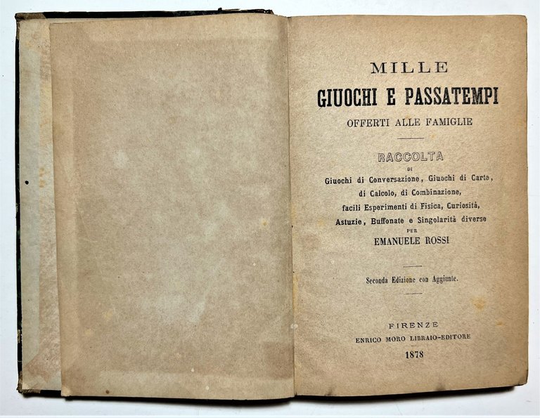 E. Rossi - Mille Giochi e Passatempi offerti alle Famiglie - ed. 1878 Testo in lingua italiana. Pagine 223 Copertina rigida. Condizioni buone con segni del tempo come da foto