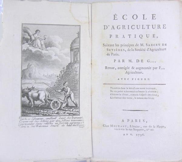 A Paris, chez Meurant, an 5 (1796). In/12 en couverture d’attente, frontispice, 1 planche (charrue) in-fine, 304 pages. Rousseurs éparses. 2 premiers feuillets grignotés en bordure droite. Thomas-François De Grace), écrivain français (1713 - 1798). Il abandonna la carrière des armes pour s'adonner entièrement à son goût pour les lettres et les sciences. Il devint sous-secrétaire de l'Académie des inscriptions. Ses principaux ouvrages sont : Tableaux historiques et chronologiques de l'histoire ancienne et du moyen âge (1789) ; les Principes généraux de la langue française (1789). Grace a publié pendant plusieurs années un Almanach du bon jardinier. Barbier T2, Querard T 12