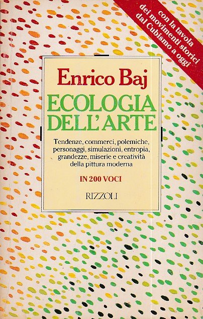 In-8°, pp. 285, (3), brossura editoriale figurata a colori con alette. Tavv. a colori e in b.n. f.t. Perfetto stato. Prima edizione. 'Un dizionario ironico, sorprendente, dissacrante, rigoroso, personalissimo compilato con piglio polemico, sorridente, caustico da un artista e critico d'arte che non cessa di stupire: Enrico Baj. Da 'AAA affittansi musei' a 'Zero', attraverso 200 voci, Baj ci accompagna lungo il tragitto aggrovigliato, tortuoso, contradditorio, non sempre immediatamente decifrabile, splendido, talvolta incomprensibile dell'arte contemporanea, chiarendone la geografia, gli equilibri vitali, gli inquinamenti che l'affliggono, le devastazioni che la minacciano, le specie in via d'estinzione e quelle, invece, in piena fioritura. Percorrendo queste pagine scopriremo quali sono i meccanismi che regolano il mercato, perché oggi un Picasso può essere quotato più di un quadro di un grande maestro del Rinascimento, le speculazioni e le mistificazioni operate, per cinismo o ignoranza, da troppi presunti esperti e pseudo-operatori culturali. Un libro polemico, originalissimo, che è anche un grande atto d'amore nei confronti dell'arte moderna intesa come affermazione di fantasia, come produttrice di immaginario e come incomparabile e insostituibile forma di libertà che deve ed è in grado di contrapporsi allo spirito di massa che cerca di invaderne i territori, avvelenandoli come l'inquinamento sta tentando di soffocare e uccidere il nostro pianeta.' (dal risvolto di copertina).