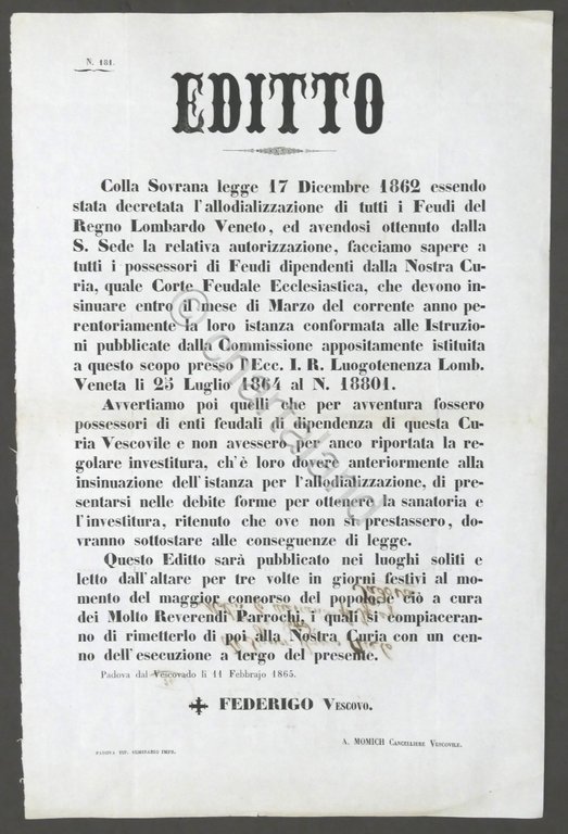 Editto: Allodializzazione di tutti i feudi del Regno Lombardo Veneto - Padova dal Vescovado - 11 Febbraio 1865