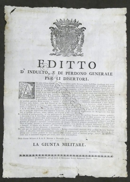 Editto d'indulto e di perdono per i disertori - Giunta Militare di Modena - 1771