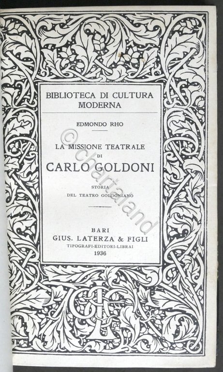Edmondo Rho - La missione teatrale di Carlo Goldoni - ed. 1936 Laterza