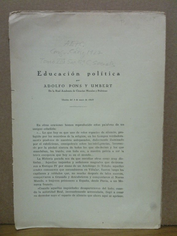 [Madrid]: Asoc. Española para El Progreso de las Ciencias, [1927].- P. 123-139 (en total 17 pags.); 4º mayor (25,5 x 17,8 cm.); Cubiertas provisionales.- Desglosado del Boletín de la "Asociación Española para el Progreso de las Ciencias" Tomo VIII. Sección 5º. Ciencias Sociales. Congreso de Cádiz, 1927.* Al tratarse de un desglose carece de cubiertas y se le han puesto unas provisionales en papel. POLÍTICA ESPAÑOLA DESDE 1833 A 1936