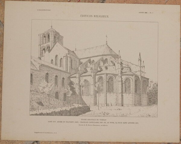 EGLISE ABBATIALE DE VEZELAY COTE EST ABSIDE ET TRANSPQT (XIII) CHAPELLE CAPITULAIRE (XII) ET AU FOND LA TOUR SAINT ANTOINE (XII) Dessin de M. Hector Degeorge architecte