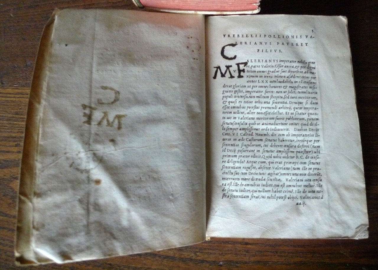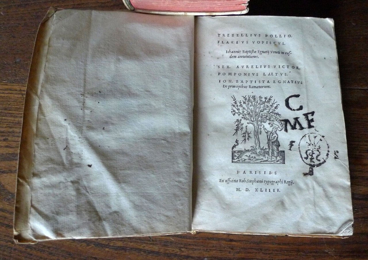 [Egnazio]TREBELLIUS POLLIO. FLAVIUS VOPISCUS. Johannis Baptistae Egnatii Veneti in eosdem annotationes. SEX. AURELIUS VICTOR. POMPONIUS LAETUS. IOH. BAPTISTA EGNATIUS De principibus Romanorum.PARISIIS, Ex officina Rob. Stephani typographi Regij,M. D. XLIIII. (1544),copertina morbida, rilegatura (coeva?) in pergamena,17,5x12 cm., pp.394, [14],testo in latino,peso: g.300