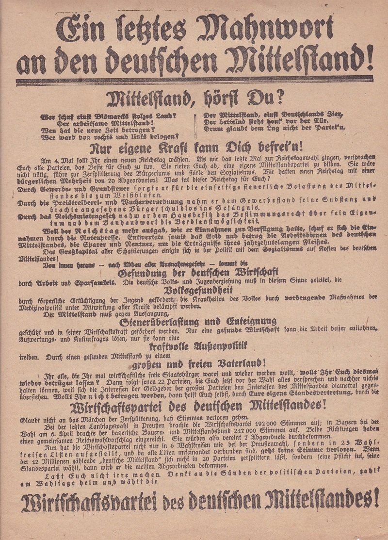 Sehr interessantes Original-Flugblatt aus dem Jahr 1924 zum Wahlaufruf für die Reichstagswahl im Mai 1924. Das Flugblatt ist beidseitig bedruckt und sprach damals Handwerker, Unternehmer und Gewerbetreibende an. Das Wahlprogramm ist weniger explizit, eher setzte man auf emotionalisierende Überschriften und Texte. Gleich zu Beginn wurde der folgende anrufende Text geboten: "Mittelstand, hörst du? / Wer schuf einst Bismarcks stolzes Land? / Der arbeitsame Mittelstand! / Wen hat die neue Zeit betrogen? / Wer ward von rechts und links belogen? Der Mittelstand, einst Deutschlands Zier, / Der bettelnd steht heut vor der Tür. / Drum glaubt dem Lug nicht der Partei'n, / Nur eigene Kraft kann dich befrei'n!". Beide Seiten sind bedruckt, rückseitig sind halbseitig die Kandidaten der Partei aufgeführt. Bei der Wahl 1924 errang die Partei 1,8% der Stimmen und 7 Mandate. Seltenes Original-Dokument aus der Parteienlandschaft der (labilen) ersten deutschen Demokratie nach 1918!