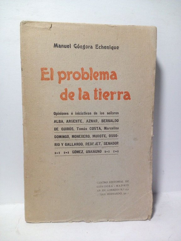 El problema de la tierra / Opiniones e iniciativas de los señores: Alba, Argente, Aznar, Bernaldo de Quirós, Tomás Cuesta, Marcelino Domingo, Monedero, Morote, Ossorio y Gallardo, Redonet, Senador, Gómez, Unamuno