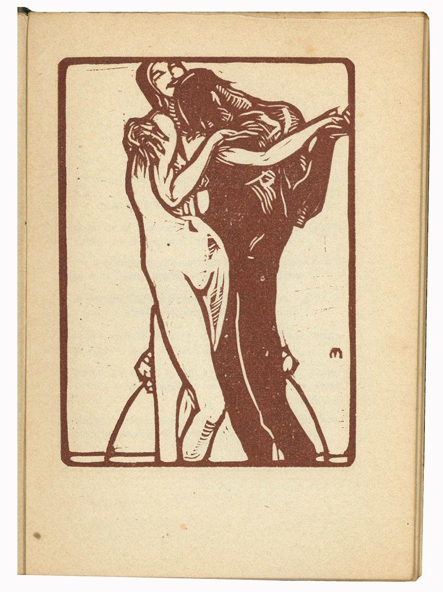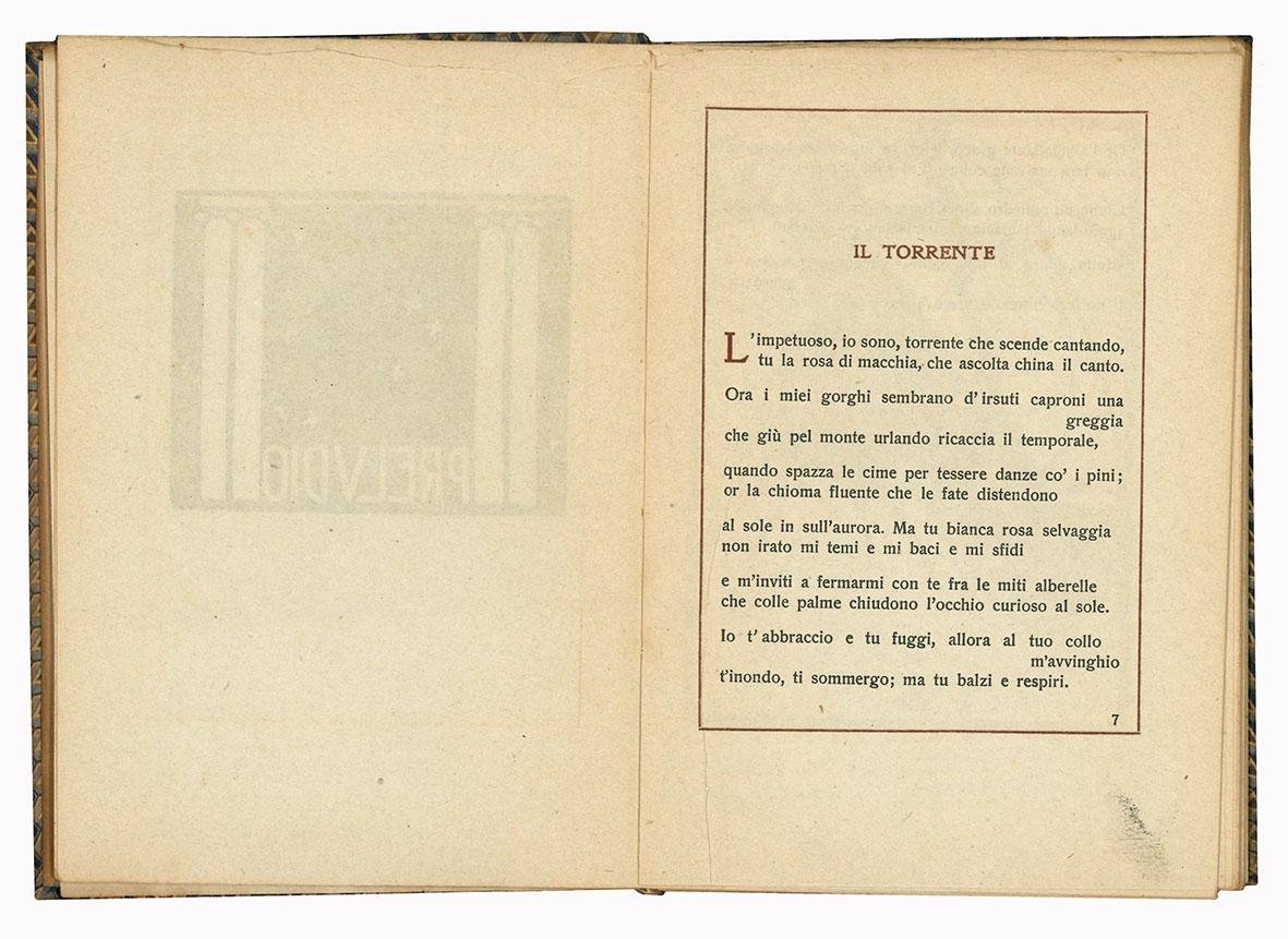 In 16mo ( mm 175x120); pp. 62, [2]. Quattro incisioni in ocra di Morbiducci, testo incorniciato. Carta leggermente ed uniformemente brunita. Fascicoli un po' sciolti. Tela a motivo geometrico, xilografia di copertina di Publio Morbiducci e titolo, applicati al piatto anteriore.