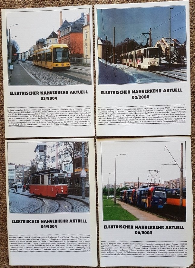 Four issues from 2004. No marks or inscriptions. No creasing to covers. Very clean very tight copy with bright unmarked paper covers and no bumping to corners. 96pp. Four copies of the Journal of German electric road transport - trams and tramways. Issues no. 02, 03, 04 and 06. News and information on German tramways city by city plus some details of trams in Austria. Includes coloured and black & white photographs.