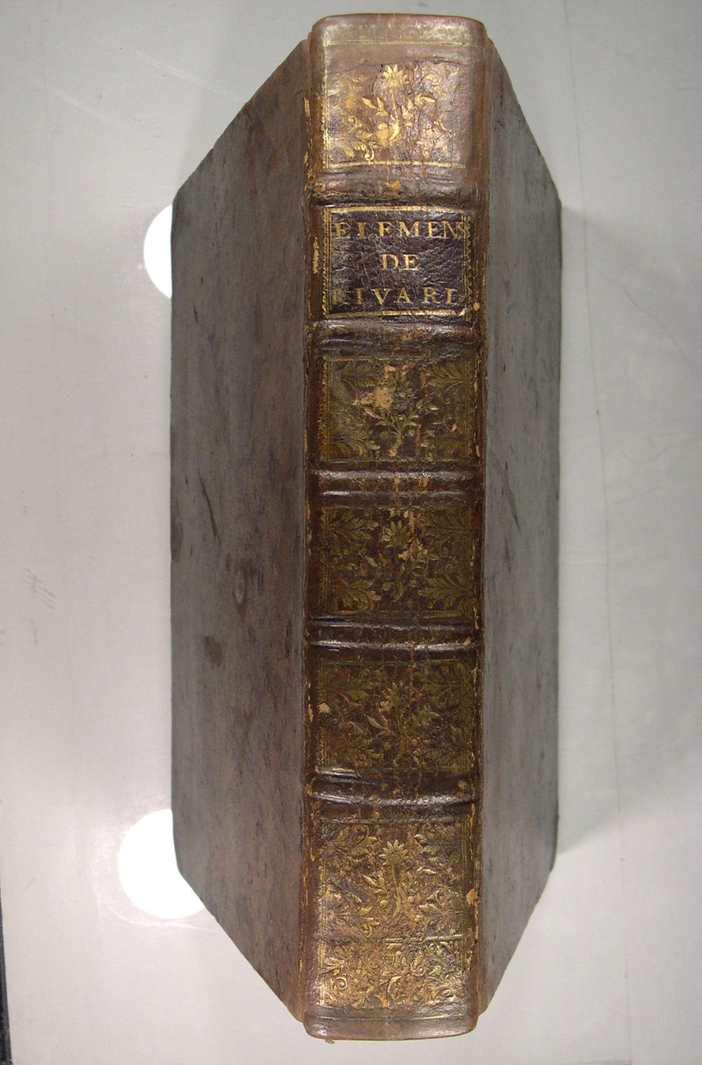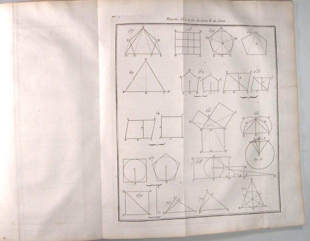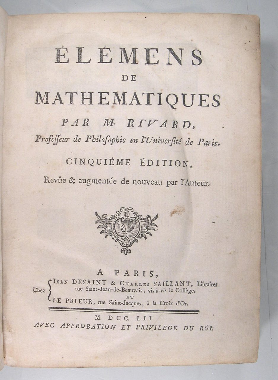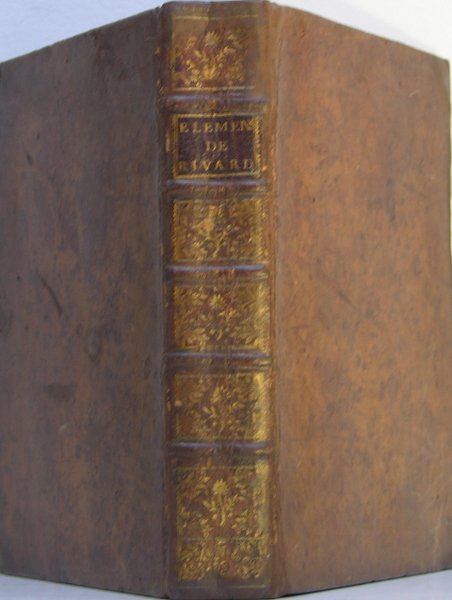 Jean Desaint à Paris, 1752. In/4 reliure plein veau du temps, dos à nerfs caissons à fleurons dorés, pièce de titre, (3ff) 322 pages, errata xxvi, 14 planches dépliantes, bandeaux. Taches isolées pages 25, 119, 147, 159, 171 ; tache légère sur la partie supérieure de la page 33 à 39, bel exemplaire néanmoins. Dominique-François Rivard (1697-1778) est un mathématicien et philosophe lorrain, qui fit ses études à Paris, et y obtint une chaire de philosophie au collège de Beauvais. Il est l’auteur de nombreux traités pédagogiques, dont les Elemens de mathématiques.