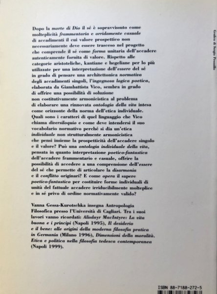 Dopo la morte di Dio il sé è sopravvissuto come molteplicità frammentaria e orridamente casuale di accadimenti il cui valore prospettico non necessariamente deve essere trasceso nel progetto che comprende il sé come forma unitaria dell'accadere autenticamente fornita di valore, Rispetto alle categorie aristoteliche, kantiane e hegeliane per lo più utilizzate per una interpretazione dell'essere del sé in grado di pensare una architettonica normativa degli accadimenti singoli, l'ingegnosa logica poetica, elaborata da Giambattista Vico, sembra in grado di offrire una possibilità di soluzione non costitutivamente armonicistica al problema di elaborare una rinnovata ontologia della vita intesa come orizzonte della norma dell'etica individuale. Quali sono i caratteri di quel linguaggio che Vico chiama diversiloquio e come deve intendersi il suo vocabolario normativo perché si dia un'etica individuale non strutturalmente armonicistica che pensi insieme la prospetticità dell'accadere singolo e il valore? Può una ontologia individuale della vita, pensata in quanto interpretazione poetico-fantastica dell'accadere frammentario e casuale, offrire la possibilità di accedere a una comprensione dell'essere del sé che permette di articolare la disarmonia e il conflitto originari? E come opera il sapere poetico-fantastico per costituire forme individuali di unità del fattuale accadere irriducibilmente molteplice e in sé prive di ordine normativamente valido?
