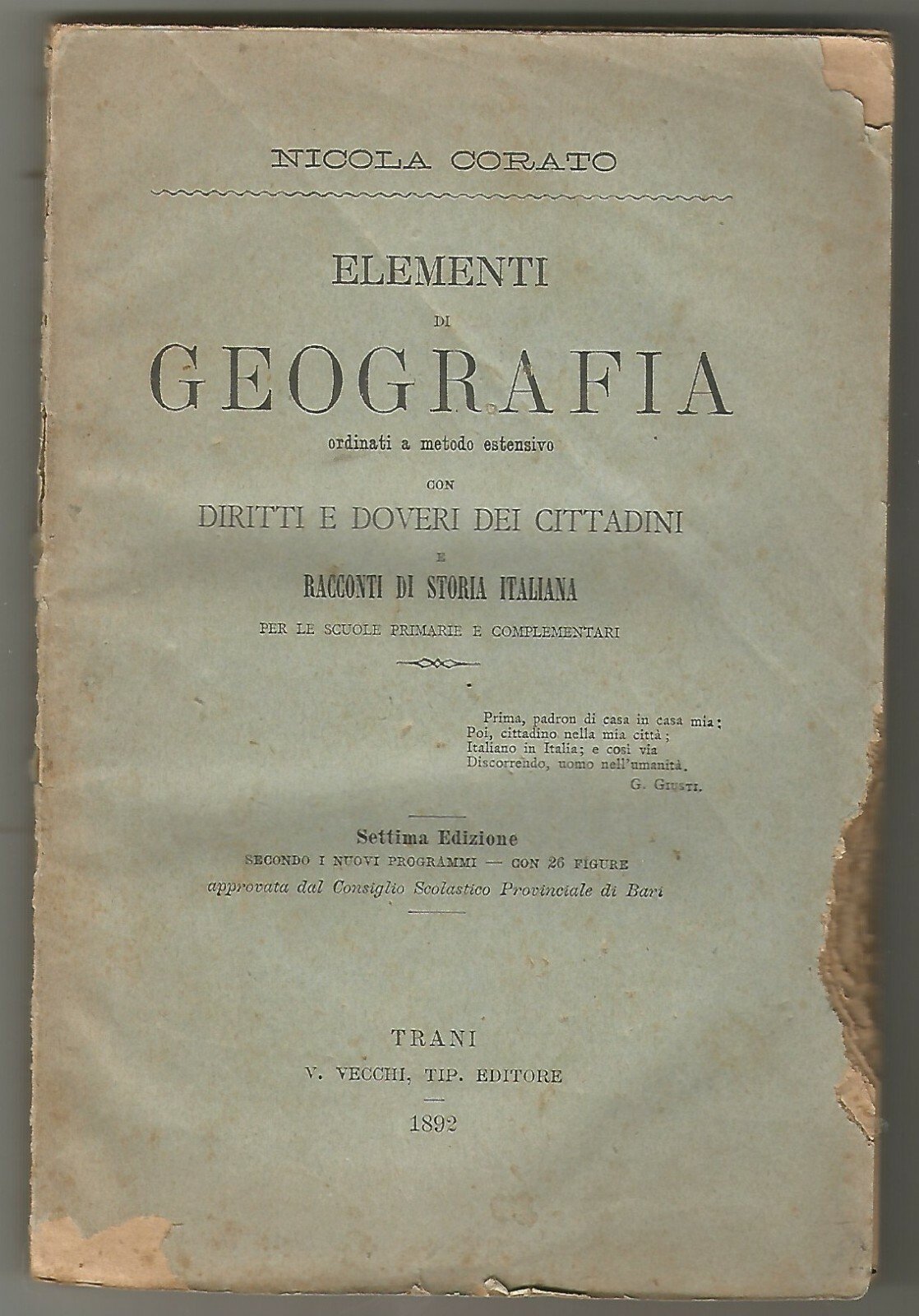 ELEMENTI DI GEOGRAFIA di Nicola Corato 1892 Trani Vecchi libro scolastico antico