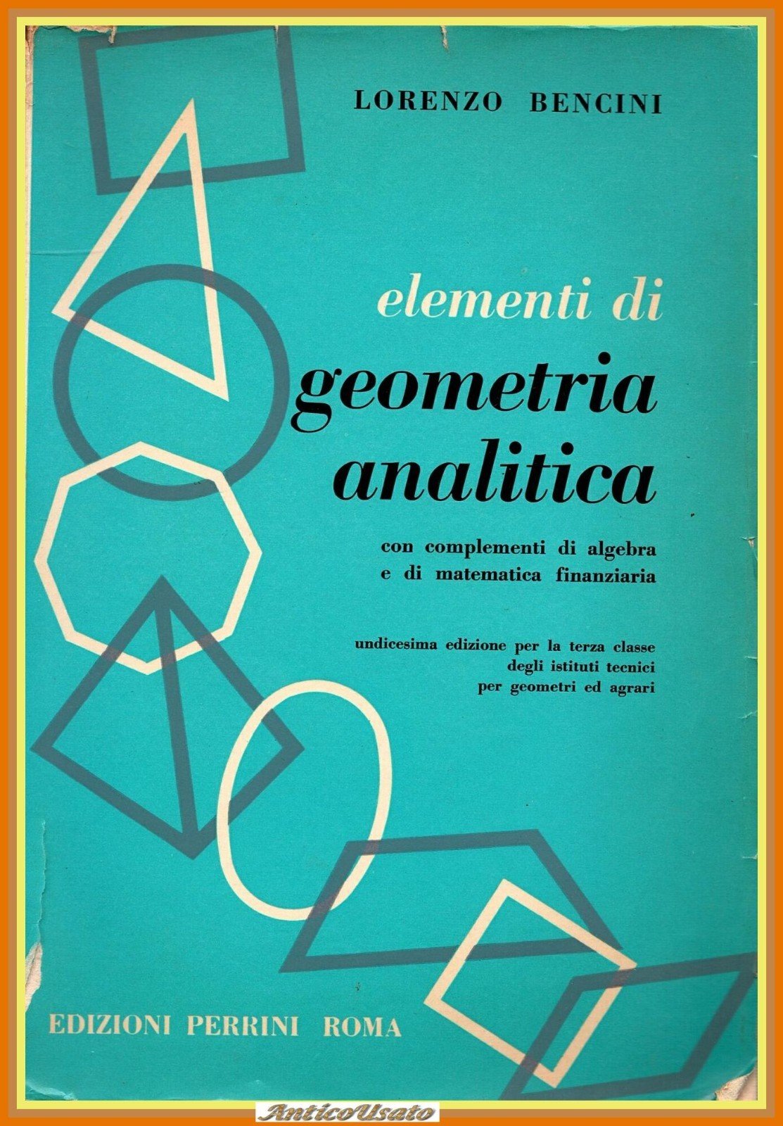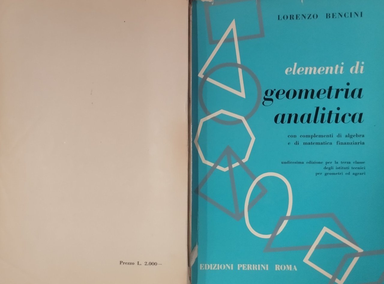 ELEMENTI DI GEOMETRIA ANALITICA con complementi di algebra e di matematica finanziaria di Lorenzo Bencini per la terza classe degli istituti tecnici geometri e agrari. Perrini Edizioni, 1964. 394 pagine. Copertina editoriale in brossura. Stato di conservazione: buono (pagine ingiallite, sottolineature a matita colorata, copertina sciupata con strappi e piccole mancanze) Libro usato saggistica