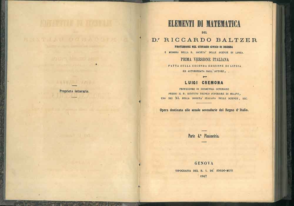 Elementi di matematica. Parte 4°: Planimetria, Parte 5°: Stereometria; Parte 6°: Trigonometria. Opera destinata alle scuole secondarie del Regno d'Italia.