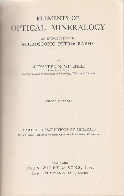 ELEMENTS OF OPTICAL MINERALOGY Volume 2 di Winchell 1948 John Wiley libro