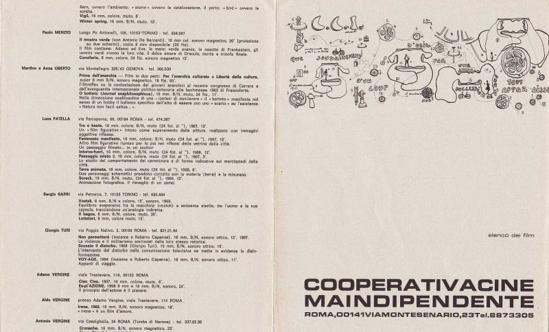 Dépliant originale con il Catalogo dei film disponibili; il foglio - due volte ripiegato - misura cm 25 x 58 completamente spiegato. La bella grafica di copertina è di Gianfranco BARUCHELLO (Livorno, 1924 - Roma, 2023). Di seguito i nomi dei cineasti presenti nel Catalogo: Massimo Bacigalupo, Pierfrancesco Bargellini, Gianfranco Baruchello, Stan Brakhage, Gianfranco Brebbia, Roberto Capanna, Emanuele Centazzo, Mauro Chessa, Pierre Clementi, Tonino De Bernardi, Giorgetta Dorfles, Celestino Elia, Pia Epremian, Mario Ferrero, Alberto Grifi, Brigit e Wilhelm Hein, Cinzio Janiro, Alfredo Leonardi, Silvio e Vittorio Loffredo, Guido Lombardi, Abbott Meader, Paolo Menzio, Anna e Martino Oberto, Luca Patella, Sergio Sarri, Giorgio Turi, Adamo Aldo e Antonio Vergine. Di ogni cineasta il Catalogo riporta indirizzo, numero di telefono, ed elenco dei film con scheda tecnica e breve descrizione. Raro importante documento, in ottimo stato di conservazione. Scrive Alberto Grifi, che della Cooperativa fu uno dei fondatori e dei massimi promotori: 'Durante gli anni Sessanta gli artisti sentono il bisogno di avvicinarsi alla cultura dei mass-media sconfinando tra pittura e cinema. Nasce così il cinema d'artista, diverso nella forma e nei contenuti, pronto a trasgredire ogni regola nell'universo della mercificata società di massa, poiché non cerca ad ogni costo i consensi del grande pubblico. (.) L'uso di pellicole a passo ridotto (16mm, 8mm e Super8) e di pellicole scadute, ha fatto sì che la maggior parte dei lavori cinematografici fosse poco conosciuta per l'oggettiva difficoltà di reperimento delle copie. Il cinema d'artista nasce quindi al di fuori dei normali circuiti produttivi e distributivi, senza un programma comune e una cultura di riferimento alle spalle. Ciò nonostante il rimando più immediato va, oltre alle Avanguardie dei primi del Novecento, al New American Cinema. La rassegna del New American Cinema, presentata da Jonas Mekas a Torino nel 1967, produsse quasi immediatamente in Italia la nascita della Cooperativa del Cinema Indipendente. Incoraggiati dai bassi costi di autoproduzione, i film-maker nostrani, consapevoli della mancanza di un mercato reale, si uniscono con lo scopo di creare nuovi canali per la distribuzione, tentando di istituzionalizzare un lavoro altrimenti disperso. Malgrado non vi siano affinità linguistiche, questi giovani artisti sono accomunati dal senso di sperimentalismo che permea totalmente il loro operato cinematografico. Vi è inoltre in tutto il cinema d'artista un aspetto militante in sintonia agli avvenimentidel '68: servirsi della macchina da presa per la registrazione immediata dei fatti e la circolazione di un'informazione 'altra' rispetto a quella trasmessa dal potere politico.' (www.albertogrifi.com)