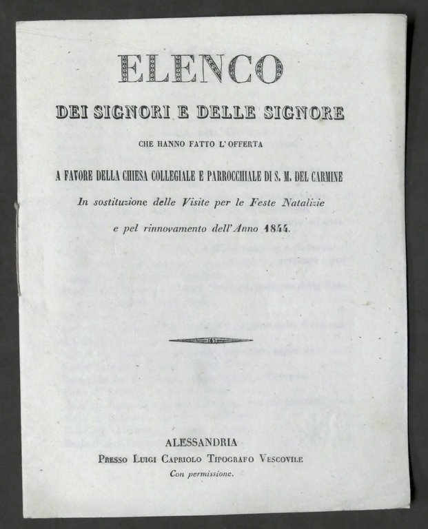 Elenco donatori offerta Chiesa di S. M. del Carmine - Alessandria - 1844