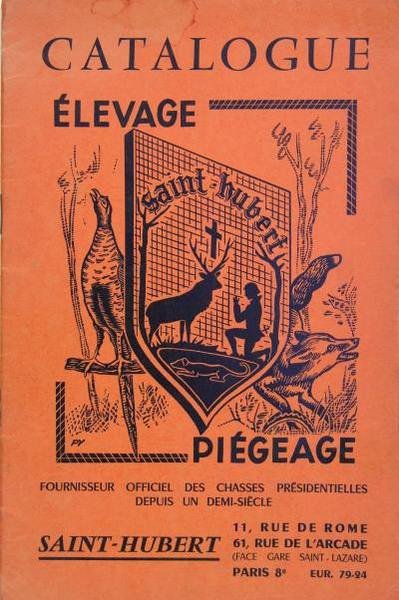 Saint Hubert, Paris, 1963. Plaquette in/8 couverture agrafée illustrée, illustrations in-texte, 36 p. Auréole claire sur la couverture. Tarif joint. Pièges fer, pièges pour rapaces et becs droits, boîtes à fauves, vêtements pour gardes et rabatteurs, reprise et conservation des reproducteurs, ponte et incubation, élevage, grillage filets.