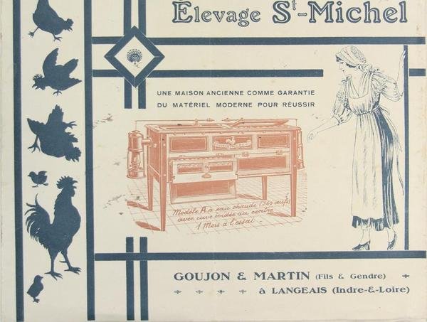 Goujon & Martin, Langeais, 1910. Plaquette in/8 à l’italienne, couverture illustrée bi-colore, illustrations en noir in-texte, 21 pages. Trace de pliure centrale de catalogue. Nombreux modèles de couveuses, poulaillers, clapiers, canardières, races de coqs et de lapins.