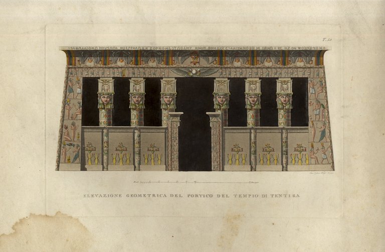[Firenze], [nello stabilimento posto nei Fondacci di S. Spirito n. 1993], [1835], incisione in rame accuratamente acquerellata a mano all'origine, mm. 215x330 (l'impronta della lastra), mm. 330x495 (il foglio). Tavola 50 tratta dall'opera: Valeriani, Domenico. Atlante del basso ed alto Egitto illustrato dal professore Domenico Valeriani, sui disegni di Denon [.]. Firenze, nello stabilimento posto nei Fondacci di S. Spirito n. 1993, 1835-1837. Sottoscritta in lastra in basso a destra: Cav. Cosimo Rossi diresse. Gora al margine bianco inferiore, sulla sinistra, per il resto ottime condizioni.