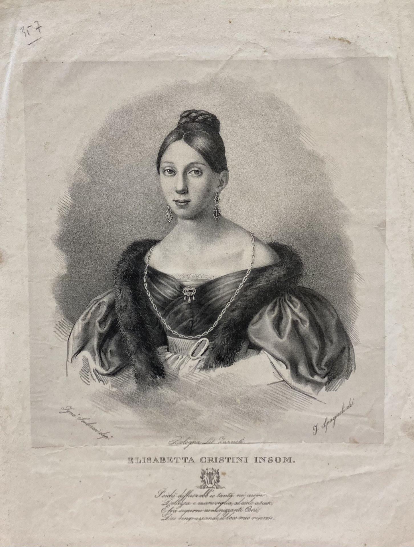 Elisabetta Cristini Insom (Bologna, 1812 - ivi, 1838), pianista. litografia com. 30 x 39,5 Buono (Good) Buon es..